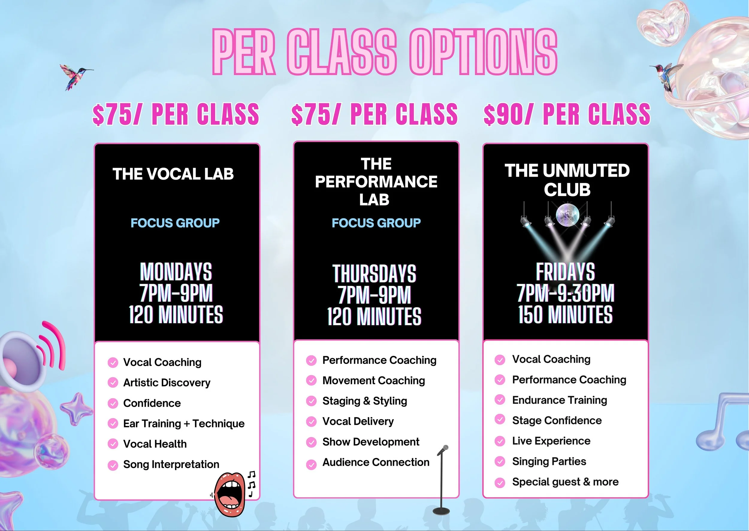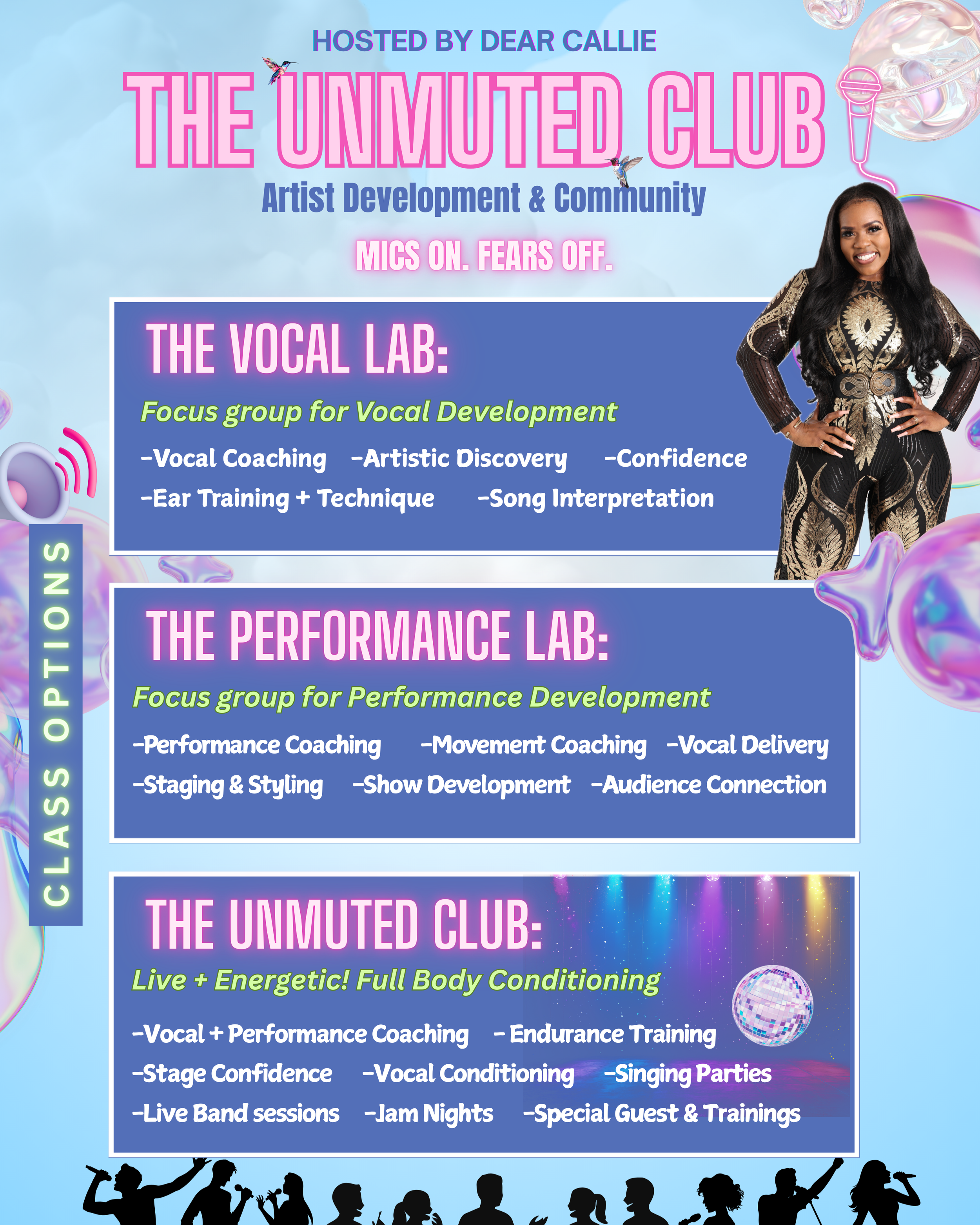 The Unmuted Club is a high-energy, live group training experience for emerging artists. All vocalists (singers, rappers, and creatives) train together because we’re more alike than we are different. Everyone receives the same strong foundational development.